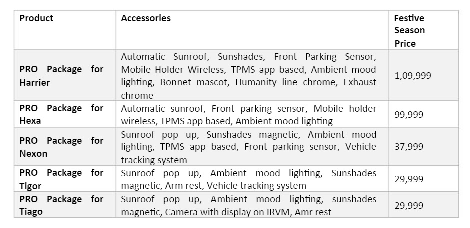 On the launch of the Pro packages for Tata cars, S.N Barman - VP, Sales, Marketing, Passenger Vehicles Business Unit, Tata Motors said, “To add more cheer to this year’s festive season, we are delighted to announce the launch of the Pro Edition accessory packs for our valuable customers. These accessory packs will not only enhance the aesthetic appearance of our cars, but will also provide an exciting overall customer experience for all our existing new buyers. We are hopeful that these accessory packs will make this festive season more joyous for our customers, adding a dash of style and character to their cars.”