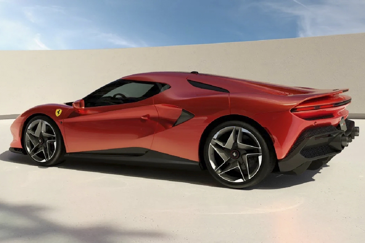 The car’s flanks are also very different to the donor F8 Tributo, with an aggressive side opening that informs the surfacing right the way along the doors, followed by a very subtle haunch flair that ultimately terminates in that flat rear wing. The rear end is especially dramatic, with an inner volume dissected with a black strip which also integrates slim LED lighting. Finally, the five spoke wheel design is also new and bespoke, referencing other wheel designs used on the F8 and SF90.