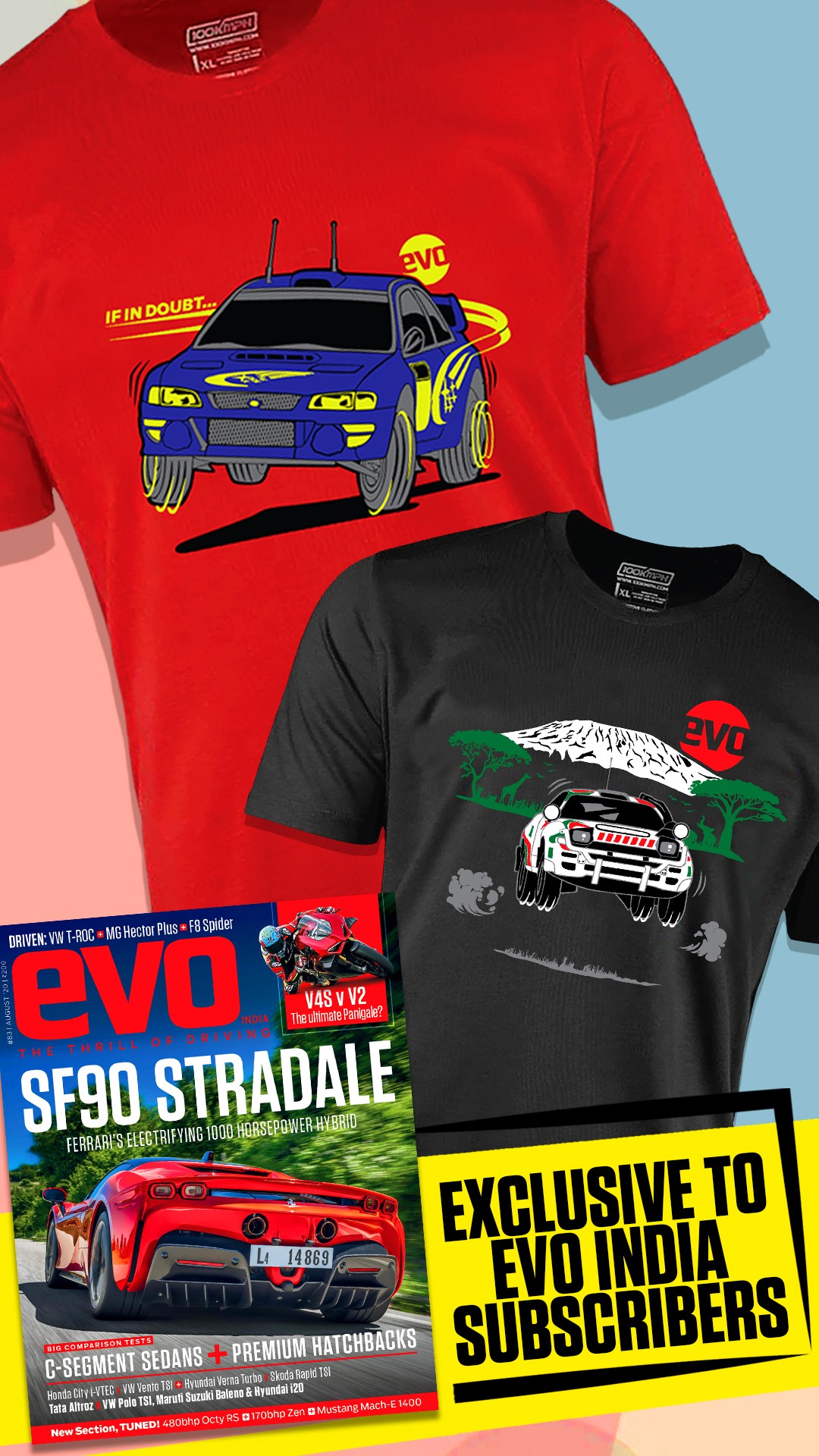 Our design team has been hard at work creating some kick-ass merchandise with our partners at 100kmph. We’re now giving away these cool rally-themed t-shirts, free, to our subscribers. Plus subscribers get free stickers with every issue, every month
