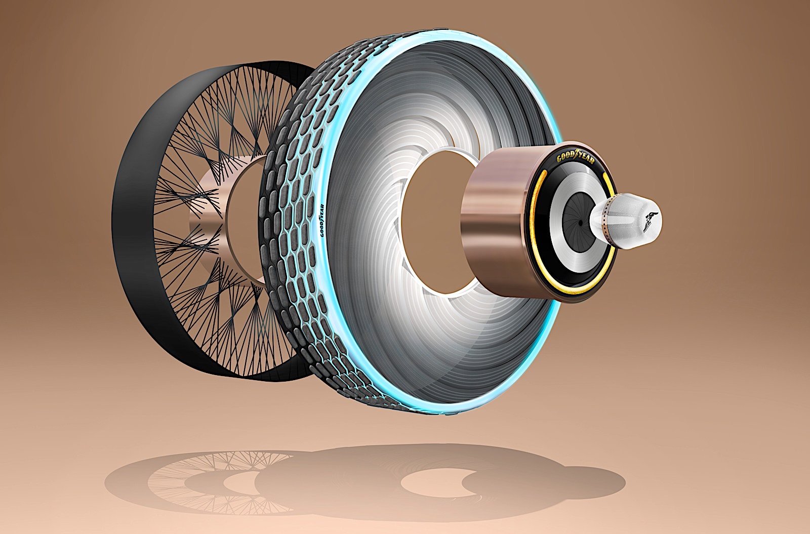 All the users have to do to recharge or re-tread the tire is to insert a Capsule containing the above mentioned liquid mixture into the centre of the wheel. The Goodyear states that as the surface of the tread wears down, the tread will then regenerate itself accordingly with the help of artificial intelligence to generate a custom compound blend tailored to each different use case scenario.
