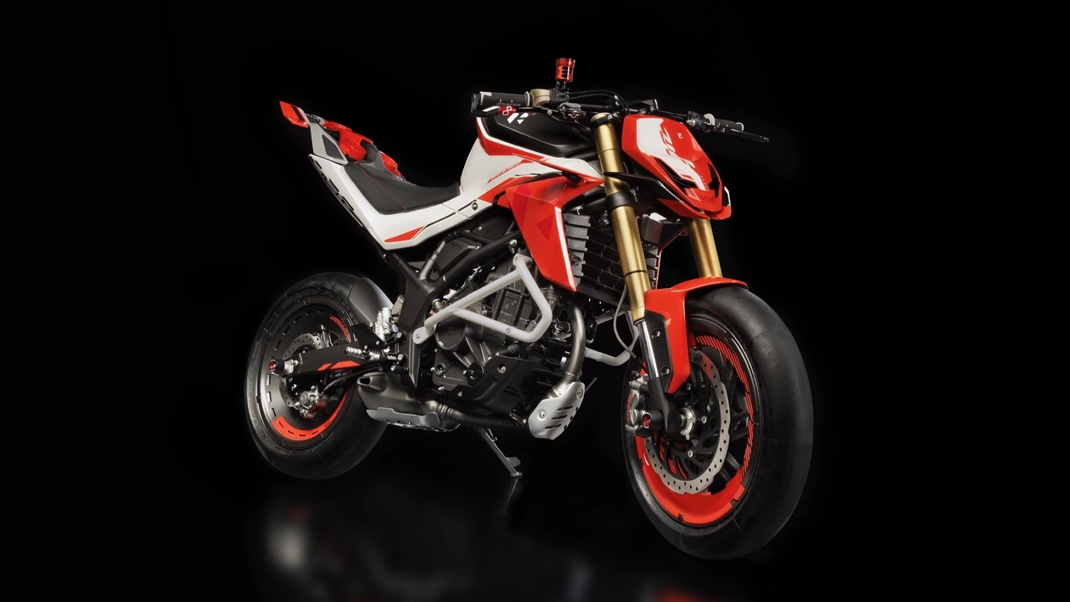 The Hero Concept 2.5R Xtunt has an aggressive stance and no lighting elements on the motorcycle because it is a concept. The motorcycle is finished in a red and white colour scheme. The wheels are red as well, and the front forks are gold.