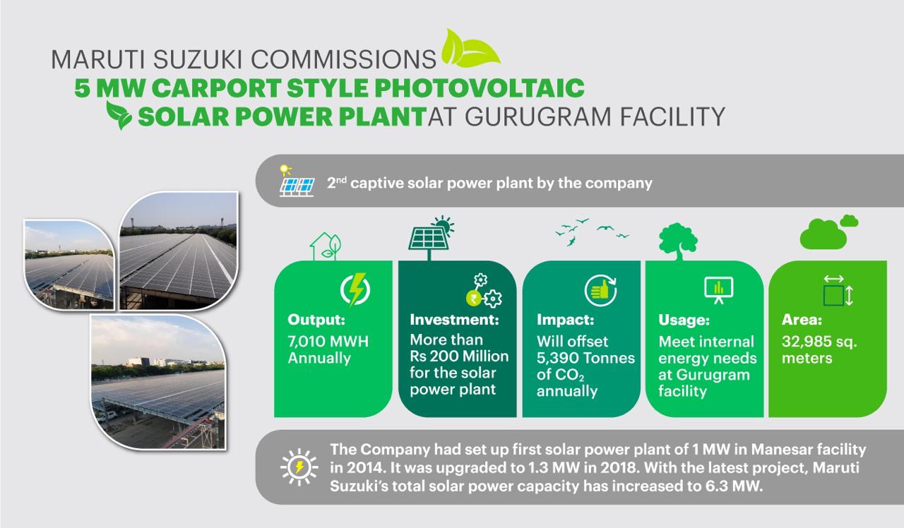 Maruti Suzuki India Limited strengthens its commitment towards a greener future by advancing its efforts in creating sustainable manufacturing with the commissioning of five-megawatt carport style photovoltaic solar power plant in Gurugram. With an investment of more than Rs 20 Crore, this solar power project will offset 5,390 tonnes of CO₂ emissions annually, for the next twenty-five years. It will also give an output of 7,010MWh of power annually.