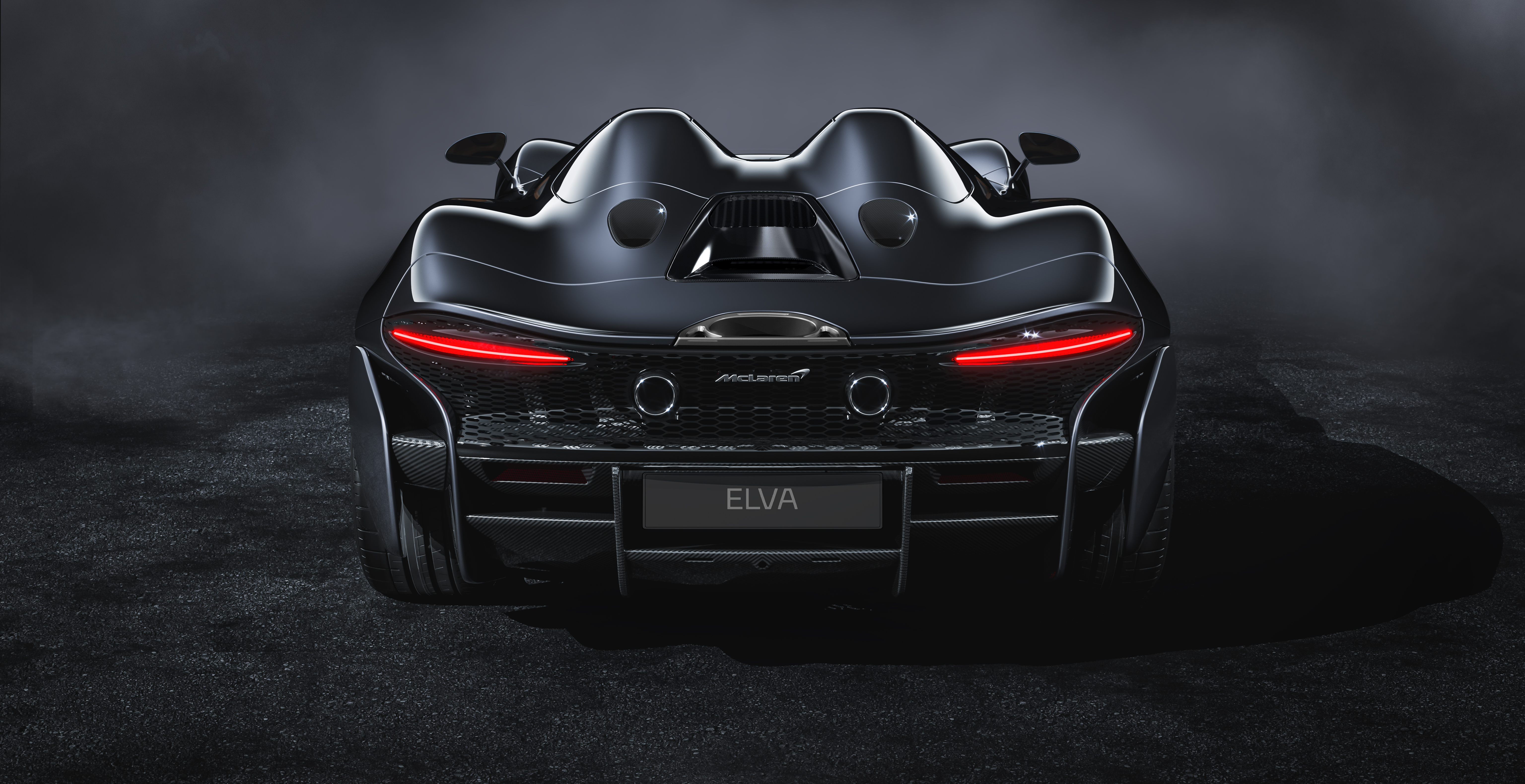 McLaren Elva rearLike on many McLarens, the rear is mostly open for the sake of releasing the intense heat produced by the engine and exhaust system. Rather than an open mesh, the rear fascia is of laser-cut aluminium, which integrates a new design of almond-shaped rear light units, as well as the lower two exhaust outlets and rear diffuser.