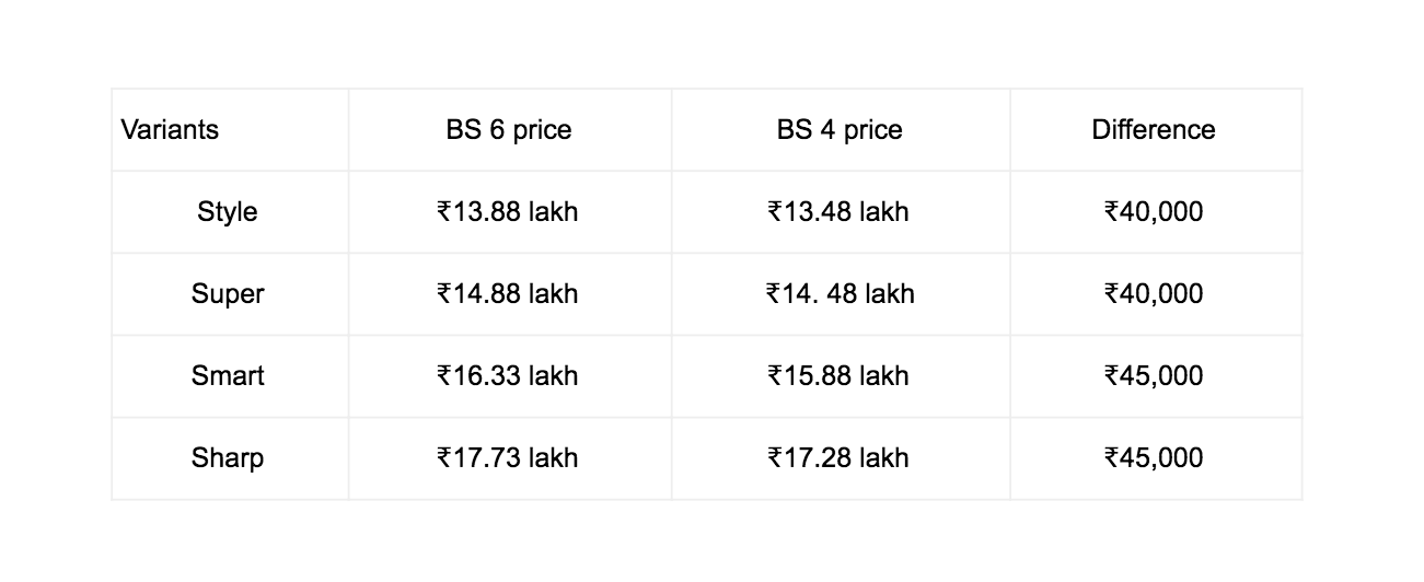 Here is the price list comparing the BS4 and the BS6 models of the Hector