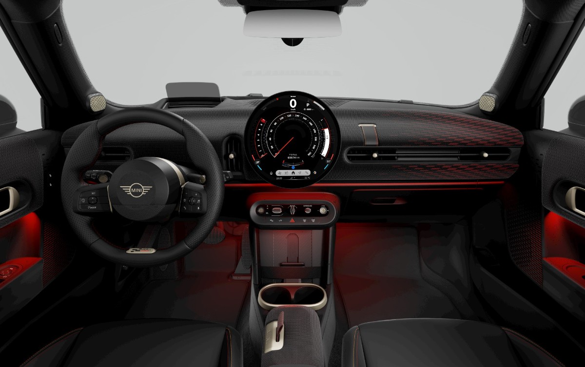 The interior includes sports seats with black upholstery and a JCW dashboard trim. The steering wheel has paddle shifters and the central feature of the dashboard is a 240mm circular OLED touchscreen display that offers access to navigation, entertainment, and other functions. Other interior features include a head-up display, a Harman Kardon sound system, and a fisheye camera for capturing images or video inside the car.