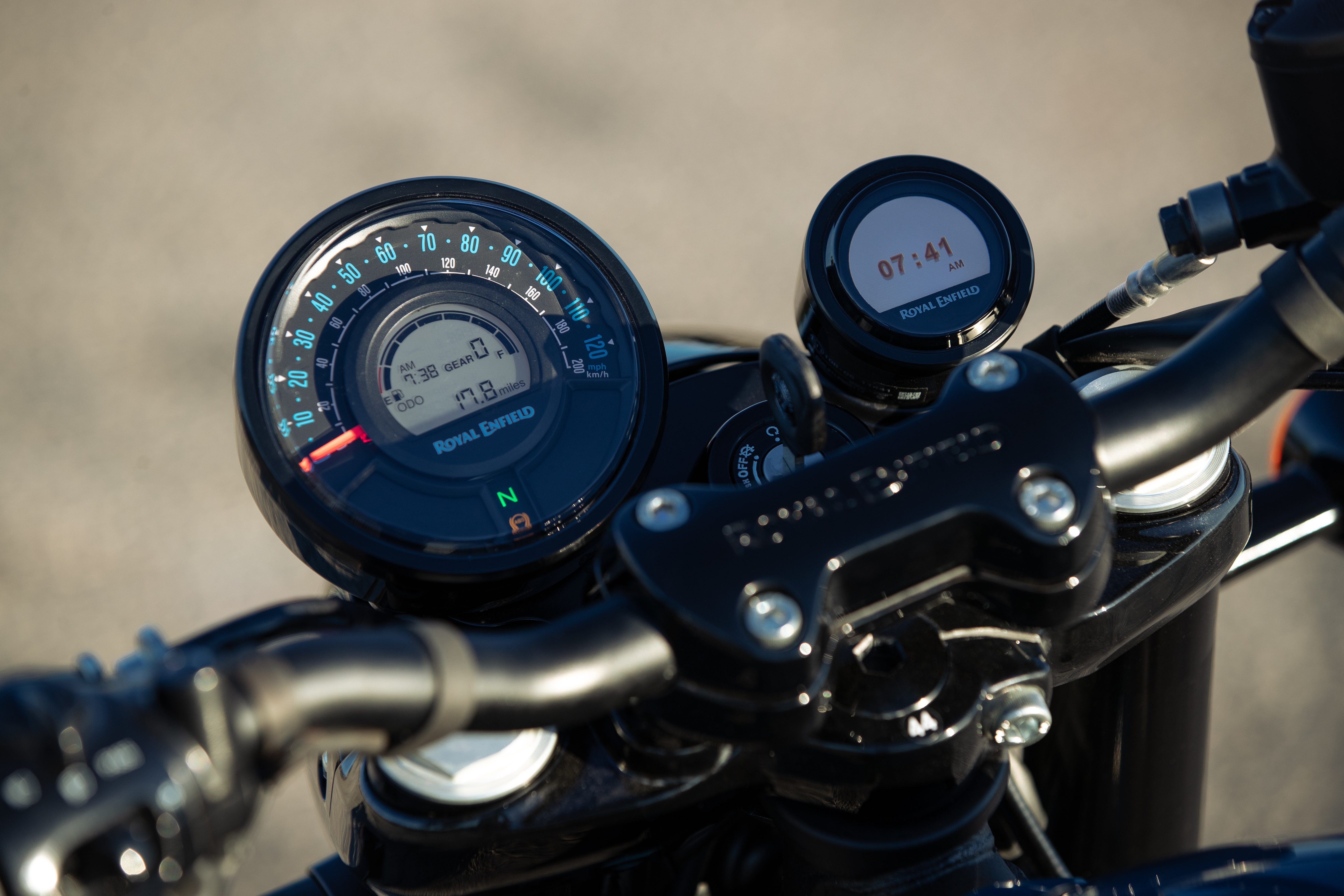 As is the case with most Royal Enfield motorcycles, the bike gets little in the name of electrical gizmos. However, it incorporates all the conveniences of modern engineering including an electric starter, fuel injection, ABS, USB charging port, and full LED illumination. The single round-dial instrument cluster features an analogue speedometer and digital display showing time, fuel level, gear position, odometer, and other parameters. There is room on the handlebar for RE’s optional Tripper navigation system.