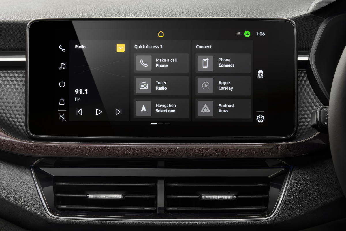 The Active variant of the Kushaq gets a 7-inch colour touchscreen infotainment system which enables the user to use Android Auto and Apple Carplay by connecting their smartphone with a cable. The ‘Ambition’ and ‘Style’ variants get a 10-inch colour touchscreen with Skoda’s SmartLink enabling users to connect their smartphones to the system wirelessly. There are two USB-C ports in the front and the Style variant can also be specced with a wireless charging pad.