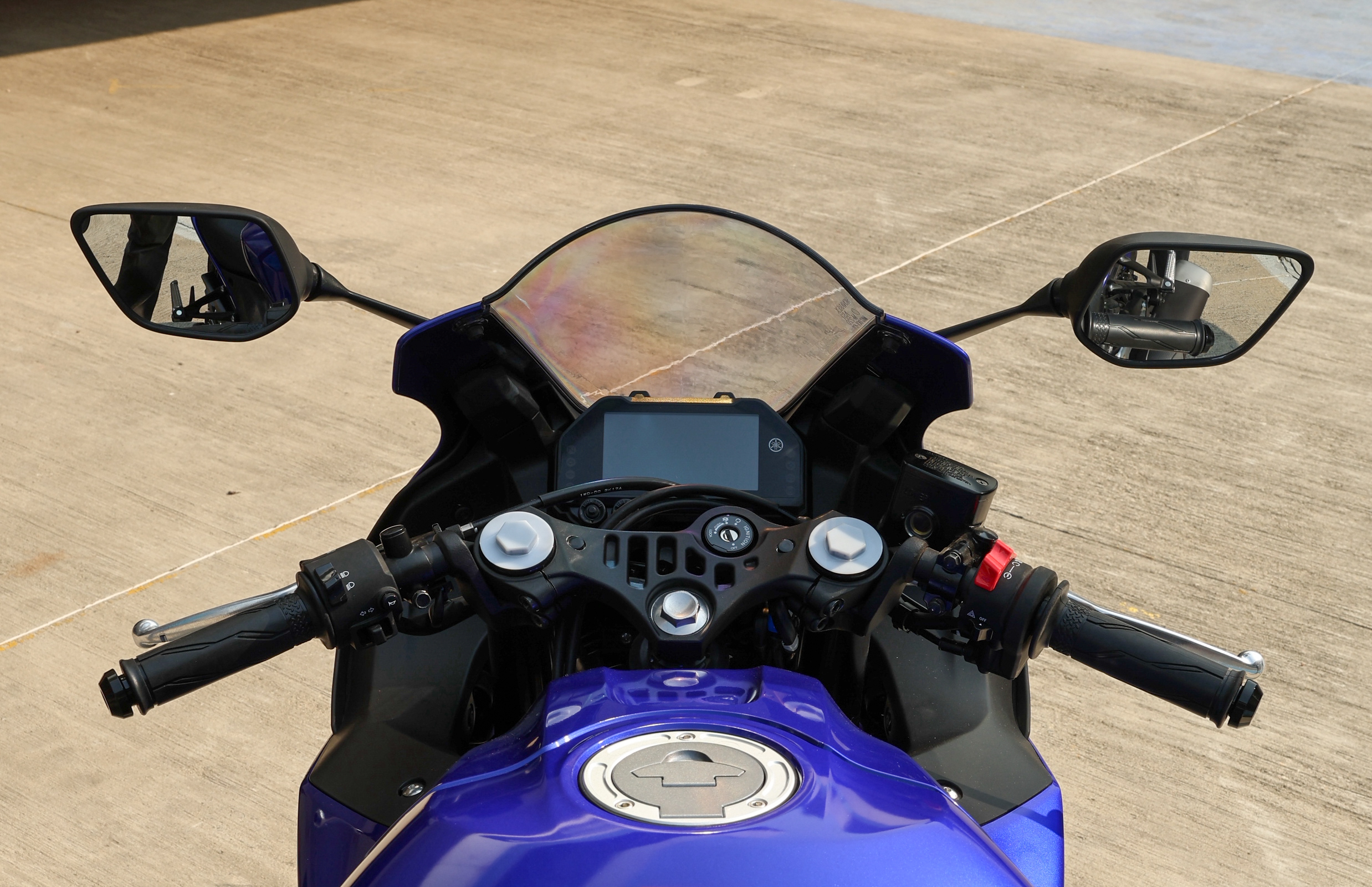 The Yamaha R3 features clip-on handlebars