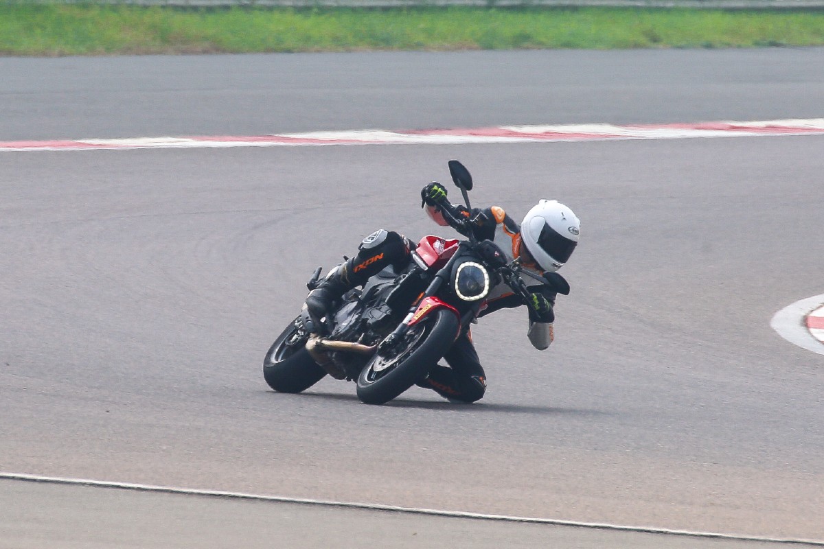 And that's how you do a knee-down!When it comes to the way it handles, the turn-in is sharp and the bike feels light on its feet. Its very easy to get it leaned over in corners — you have good leverage from the wide handlebars — and keep it leaned over. Fast directions are super easy as well, the motorcycle flicking from one side to the other effortlessly. Grip levels are impressive, helped in no small part by the Pirelli Diablo Rosso 3s. The bike was at home on the track, but I suspect it will be a proper corner carver out on the road. That nimbleness combined with the drive from the engine should make it really entertaining on narrower roads. Its super easy to manage as well. At no point does it feel heavy, cumbersome or unwieldy.