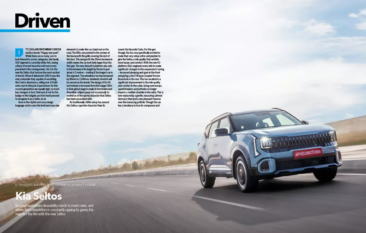 Also in this issue its a group test featuring three Mahindras with plenty of overlap — XEV 9e, XEV 9S and XUV700 to find out if the freshly arrived 9S is the best of 9e’s and 700’s worlds? We spend time in India with the new Maruti Suzuki e Vitara and discover exactly why this product has the potential to change the EV game in India. We also trace the lineage of Audi’s five-cylinder with Quattro, RS 2 and RS 3 in the stunning French Pyrenees. Switching gears to 2026’s first drive reviews, we’ve got the all-new Kia Seltos, the much anticipated duo of Tata Harrier and Safari petrol variants, followed by the Renault Triber facelift — the most affordable 7-seater in its class and the Citroen C3 X making up the this month’s French brigade.