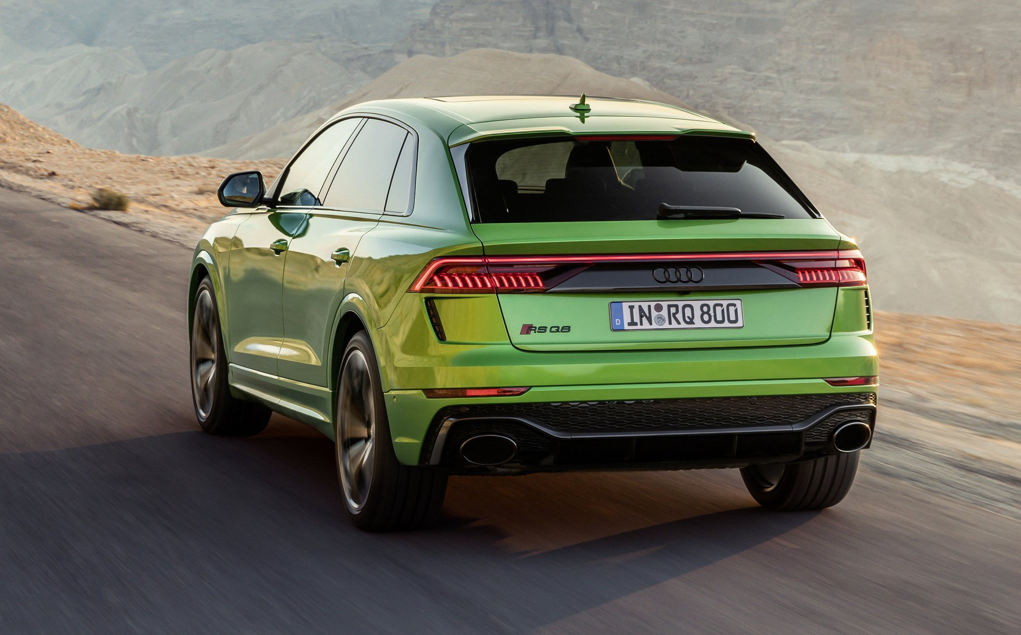The RSQ8 gets a more aggressive look overall as opposed to the Q8. This is thanks to the huge gaping air intakes, roof mounted spoiler and the complete lack of chrome anywhere on the outside, even the Audi badges are blacked-out. There is a carbonfibre grille surround as well as a carbonfibre panel joining the taillights, we expect that to be a costly optional extra though. As is with all Audi RS models, it gets oval exhaust tips.