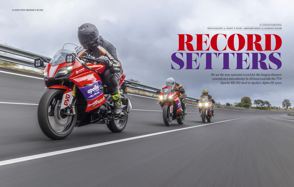 For 20 years the 24-hour FMSCI Indian National Record set by the editors of this magazine with the Karizma stood strong. Then last year a new India Book of Record was set on a 1200cc motorcycle. And now we’ve broken both records with the TVS Apache RR 310. And to top it all we set the record using one set of Apollo Alpha H1 tyres. This is the story of grit, determination and endurance of both man and machine – to hit the ultimate 24-hour records.
