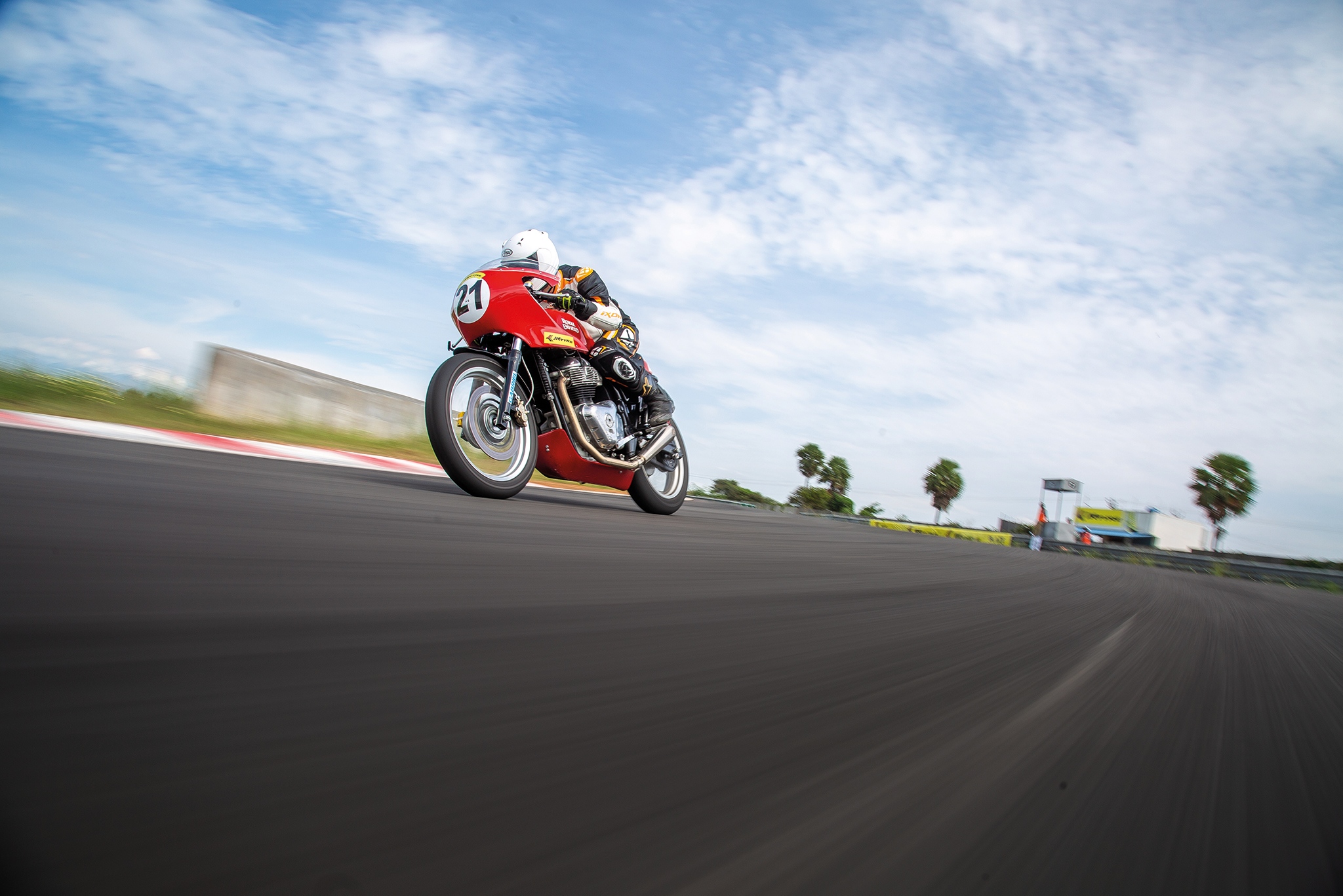 I’m crouched over the tank in a race tuck. It’s cramped. The clip-ons are low down — below the triple clamp. The footpegs are high up. I’m so glad I didn’t have a big belly to contend with here — there really was very little room. I’ve got the throttle wide open as I blast down the main straight of the Kari Motor Speedway — my eyes scanning the road ahead through the little bubble fairing for my braking marker. I catch the speedo needle hitting about 155kmph on the clock. Not bad, I thought, until I realised I’d lost sight of my marker! The 150m board had flown past me, now the 100m marker… brake! Chin up, slam the brakes and drop four gears. It’s a deceptive left-hander, this C1 on the newly surfaced track — it is much tighter than it seems, and you’ve got to really get the bike slowed down to hit the apex and follow through to C2. Push the bike in — and it needs a push — but there’s incredible grip and feel from the front end as it nails the corner, and then the next. And the one after that. Get back on the gas down the back straight and the twin-cylinder engine rumbles and roars — nothing like the high strung engines we’re used to listening to at the track but delightful all the same. Retro racing is what Royal Enfield is calling it. And I’m all for it.