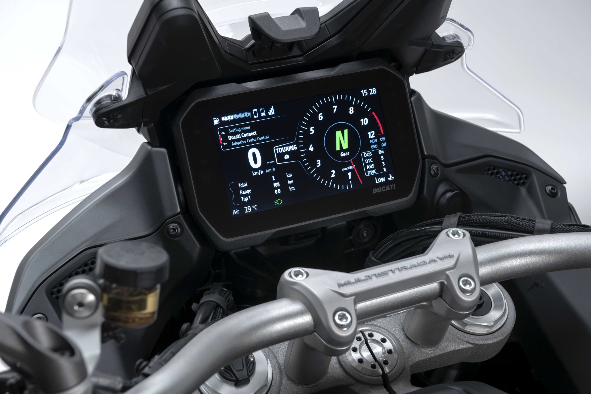 TFT screen is 5 inches on the base variant, 6.5 inches on the S and S SportWe now move to the differences between the various trim levels, starting with the standard V4. It gets Marzocchi suspension front and rear, with 50mm forks, along with Brembo M4.32 radial calipers. There’s also a 5-inch colour TFT screen, with Ducati’s multimedia system. Moving now to the S variant, and the first big change is the electronic semi-active Skyhook suspension, the upgrade to Brembo Stylema calipers, and the option for wire-spoke wheels as well as cornering lamps. Once in the saddle, there’s keyless ignition and a larger 6.5-inch TFT dash (which can be toggled via a new backlit, bar-mounted joystick control system) featuring smartphone-based navigation via the Ducati Connect app, along with an up-and-down quickshifter, cruise control and hill hold control.