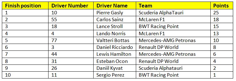 Provisional Results of race 8 of the 2020 F1 seasonNote: Provisional results. Hamilton scored an additional point for setting the fastest lap of the race.