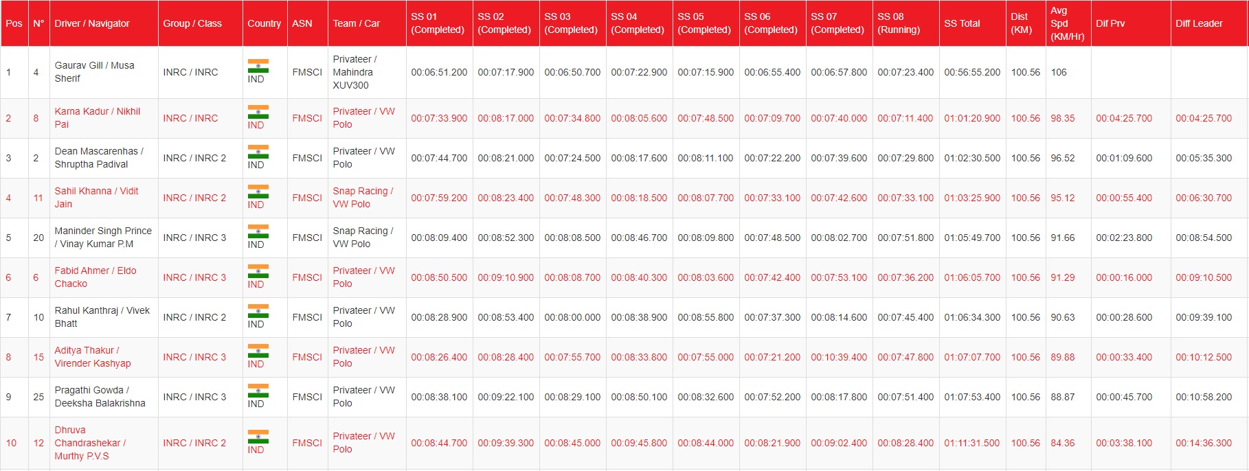 Gill took a total of 56:55.200 minutes to complete the eight stages, recording a victory by a margin of an impressive 4:25.700 minutes over the second-placed duo of MRF Tyres’ Karna Kadur and Nikhil Pai. That said, his timing for the last round, the reverse run of the Chimpu leg, did suffer a bit (cortesy a flat tyre just two minutes away from the flying start) handing Kadur a narrow victory of just about 12 seconds.