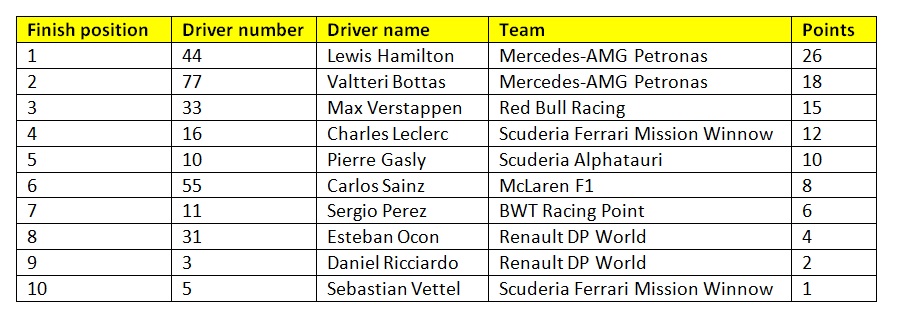 Provisional results of race 12 of the 2020 Formula 1 seasonNote: Provisional results. Hamilton scored an additional point for setting the fastest lap of the race.