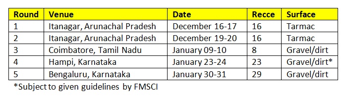 The INRC 2020 shall comprise five rallies, all of which will take place over the course of a scant one-and-a-half months. Next, the championship will be held at only four venues, namely Itanagar (Arunachal Pradesh), Coimbatore (Tamil Nadu), and Hampi and Bengaluru (Karnataka). Further, the first two rounds, scheduled for Itanagar, will both be held virtually in the third week of December.