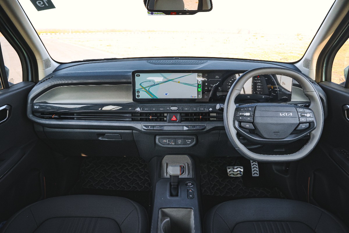 The Kia Syros gets a 30-inch panoramic screen combining two 12.3-inch screens and a single 5-inch screen between them.The steering wheel is all-new — a two-spoke design with an offset Kia logo and drive mode/traction mode buttons right on the steering wheel for easy access. Again, nicely done. Something I didn’t notice immediately was the lack of reach adjust on the steering, but that was because I managed to find a comfortable seating position and found the default reach to be ideal for me.