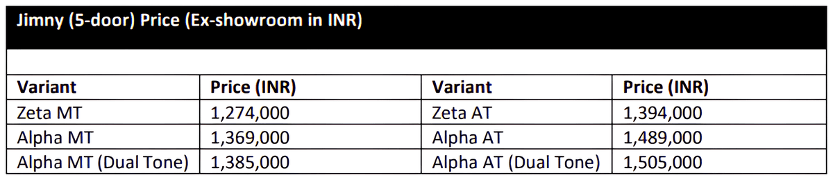Maruti Suzuki Jimny detailed price list