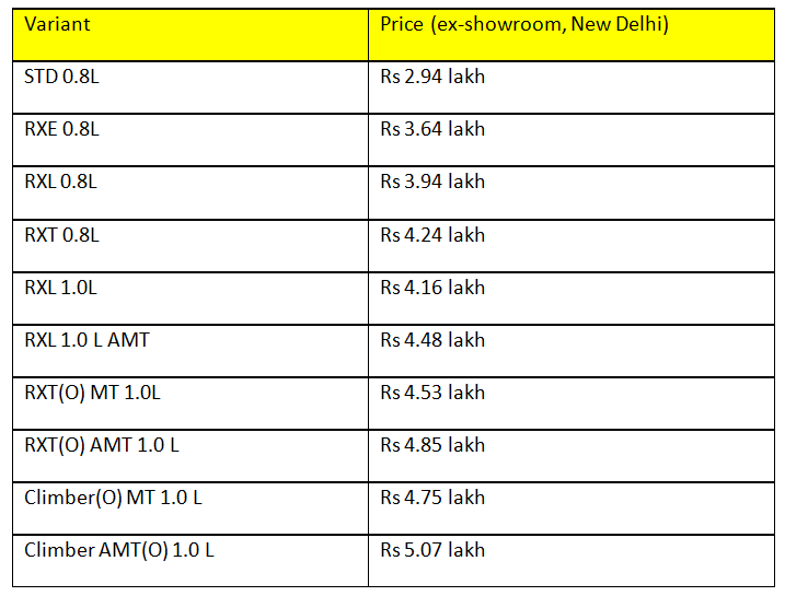 The variant-wise list of prices for the BS6-ready Kwid lineup are as follows: