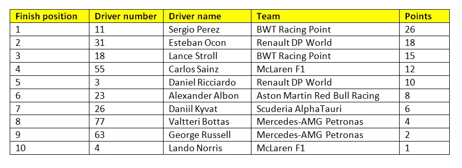 Provisional results of race 16 of the 2020 F1 seasonNote - Russell scored an additional point for setting the fastest lap of the race.