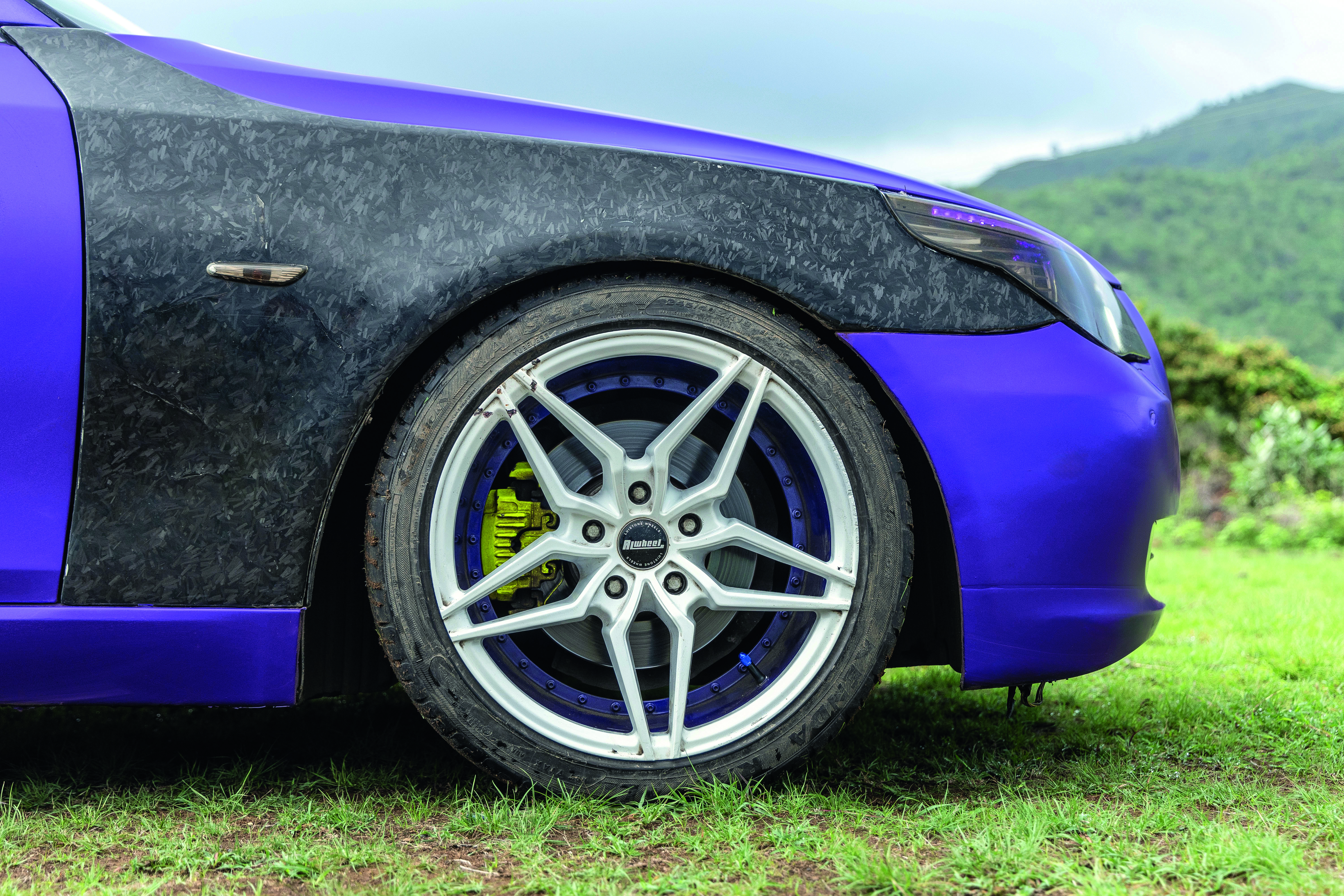 Most Indians preferred the 520d and the 530d, making this 523i a unicorn in a world of horses. This particular one gets a satin purple metallic wrap with forged carbonfibre fenders that are skimmed by hand. The headlights have been upgraded to laser projectors by Genome India and also gets RGB LED DRLs. The rear end gets smoked tail lamps, the 50th anniversary M logo, Remus exhaust tips, a rear lip spoiler and a rear windshield spoiler. Gripping duties are performed by 18-inch Kenda tyres with custom white wheels from N1 Concepts. The brake calipers have been wrapped in a fluorescent green reflective wrap – I knew these reflective wraps for the brake calipers looked cool on Instagram but when I saw it in person, I was immediately inclined to get these for my ride too. This already low 523i wasn’t low enough for Siddharth because he decided to equip it with lowering springs from Cobra – which means the ride is stiff but is as stable as it could get, special courtesy of the grippy Kenda tyres.